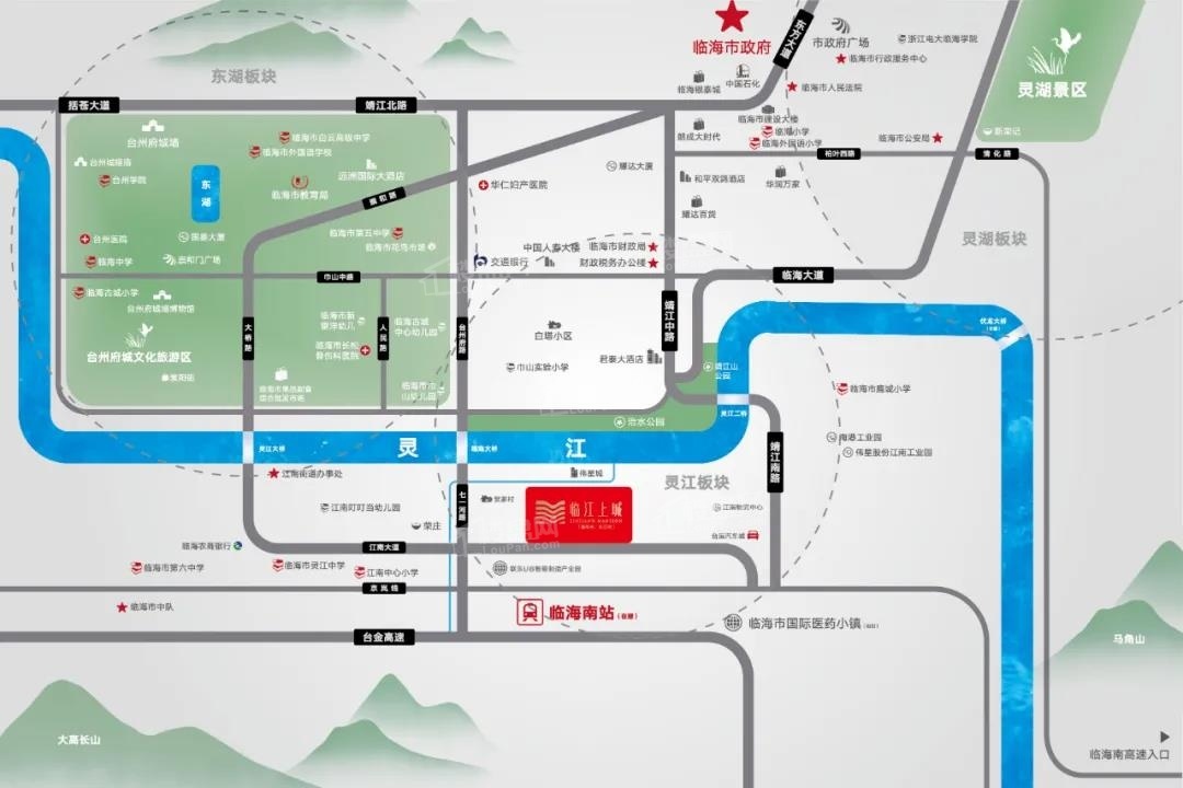三纵三横贯通全城,三纵为台州府横为东方大道、柏叶路、临海大道;距临海南站直线距离约1.5公里、距离城铁S3直线距离约1500m、七一大道/江南大道、台金高速等立体何一个位置。